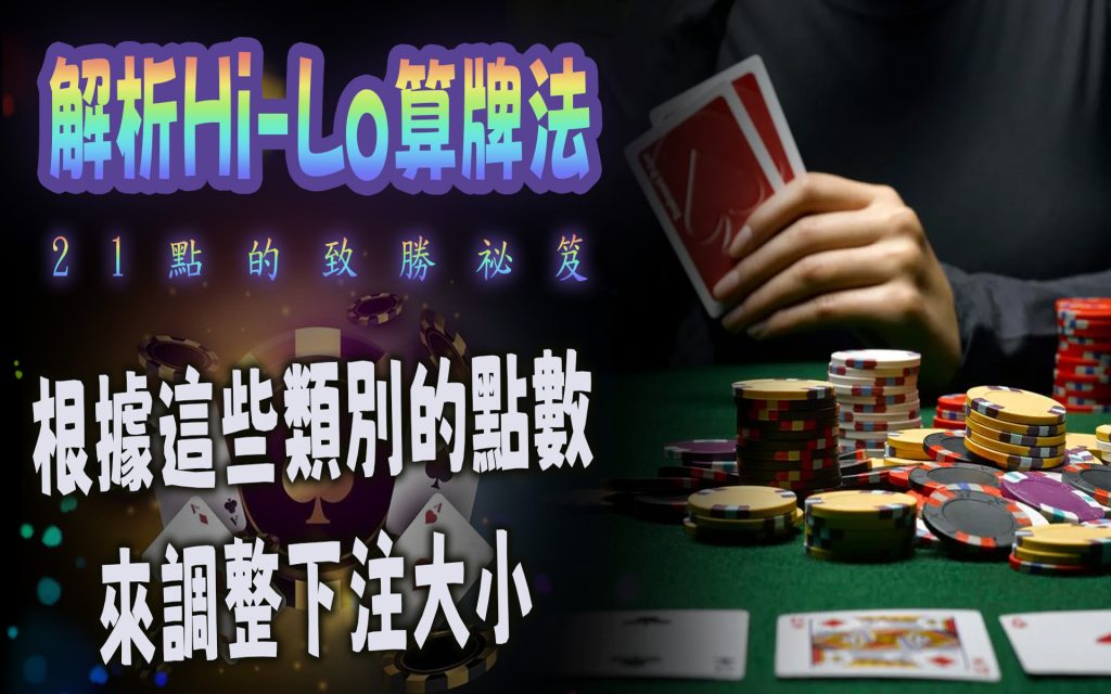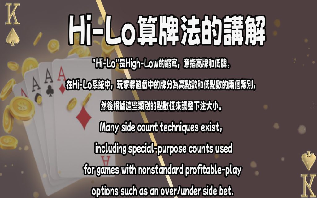 “Hi-Lo”是High-Low的縮寫,意指高牌和低牌。在Hi-Lo系統中,玩家將遊戲中的牌分為高點數和低點數的兩個類別,然後根據這些類別的點數值來調整下注大小。