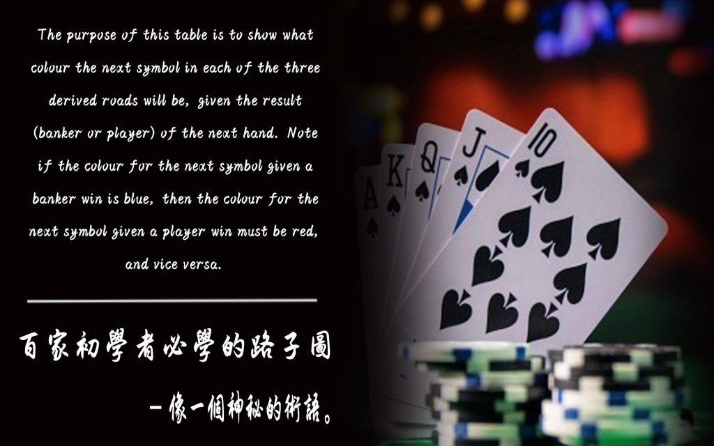 The purpose of this table is to show what colour the next symbol in each of the three derived roads will be, given the result (banker or player) of the next hand. Note if the colour for the next symbol given a banker win is blue, then the colour for the next symbol given a player win must be red, and vice versa.