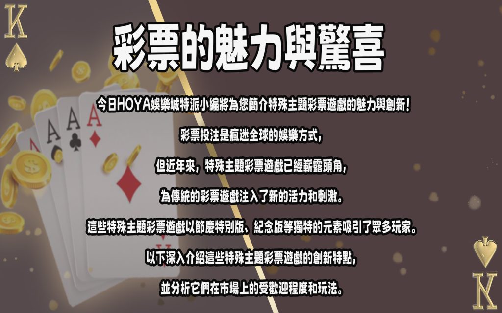 特殊主題彩票遊戲的創新元素和受歡迎程度為彩票遊戲領域帶來了新的活力。這些遊戲不僅提供了一種有趣的娛樂方式,還讓玩家參與到特定事件、節慶或紀念活動中。通過不斷創新和提供獨特的體驗,特殊主題彩票遊戲有望繼續吸引更多玩家,並豐富彩票遊戲的多樣性。