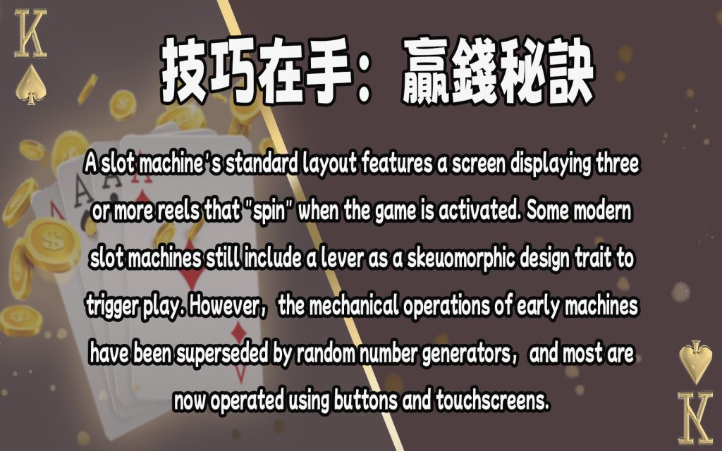 A slot machine’s standard layout features a screen displaying three or more reels that “spin” when the game is activated. Some modern slot machines still include a lever as a skeuomorphic design trait to trigger play. However, the mechanical operations of early machines have been superseded by random number generators, and most are now operated using buttons and touchscreens. ()